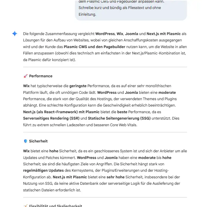 Technologisch betrachtet hat sich die Welt jedoch weiterentwickelt. Moderne Firmen setzen zunehmend auf Next.js, weil es schneller, stabiler und sicherer ist. Es braucht keine Datenbank, keine Plugins, keine Updates, die etwas kaputt machen könnten. Die Ladezeiten sind kürzer, die Sicherheit ist höher und die technische Basis ist deutlich besser für Suchmaschinen geeignet.